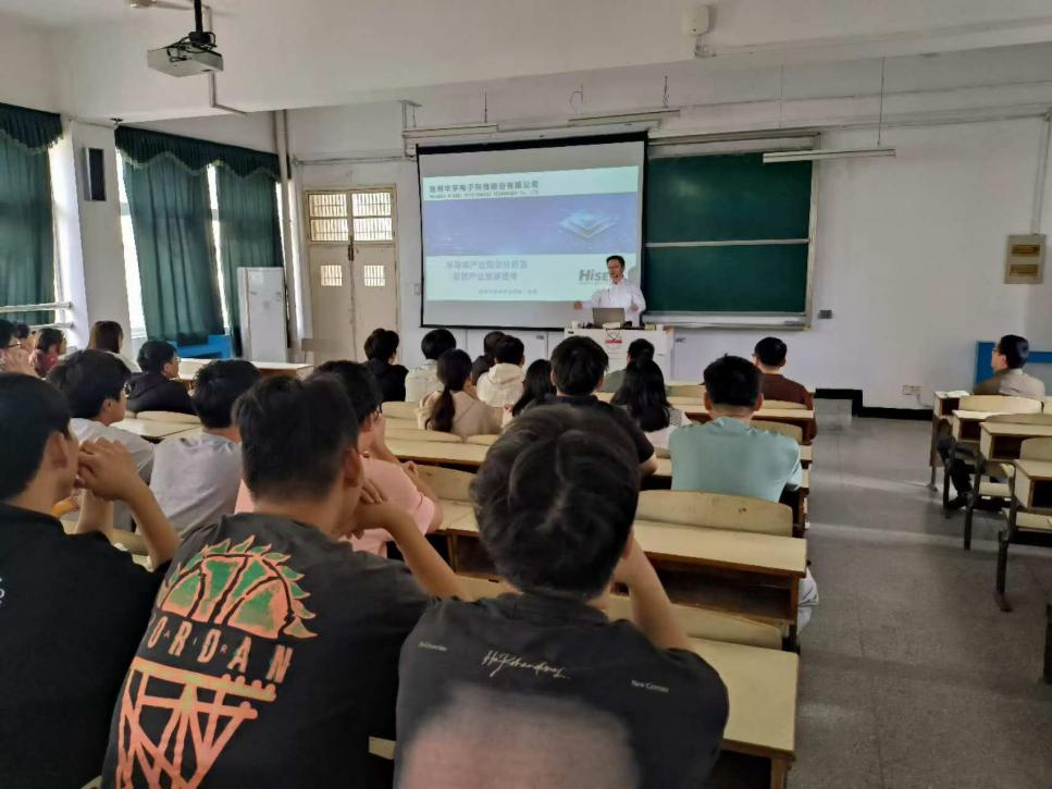 10月12日,池州华宇电子科技股份有限公司董事长彭勇为公司师生做《半导体产业分析及封测产业发展思考》的专题讲座,重点围绕半导体产业现状及面临的机遇、挑战等几个方面展开介绍。讲座由副经理詹文法主持,学院部分教师、2022级微电子科学与工程专业员工参加了本次讲座。