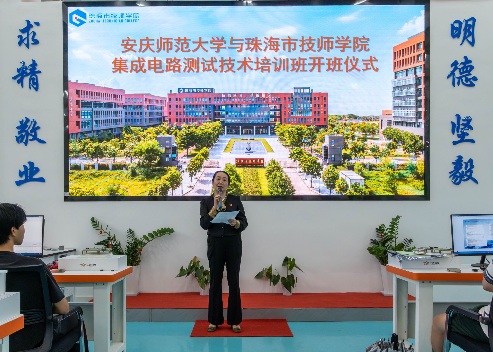 在广东省产业就业培训基地(珠海市),吴琼出席了学校承办的集成电路测试培训班开班式。吴琼感谢广东省产业就业培训基地(珠海市)的信任,她表示,通过该项目的合作,加深了122cc太阳成集团与广东省产业就业培训基地(珠海市)的联系,扩大了两地的社会影响力,提高了两地人才培养质量,实现了双方共赢。