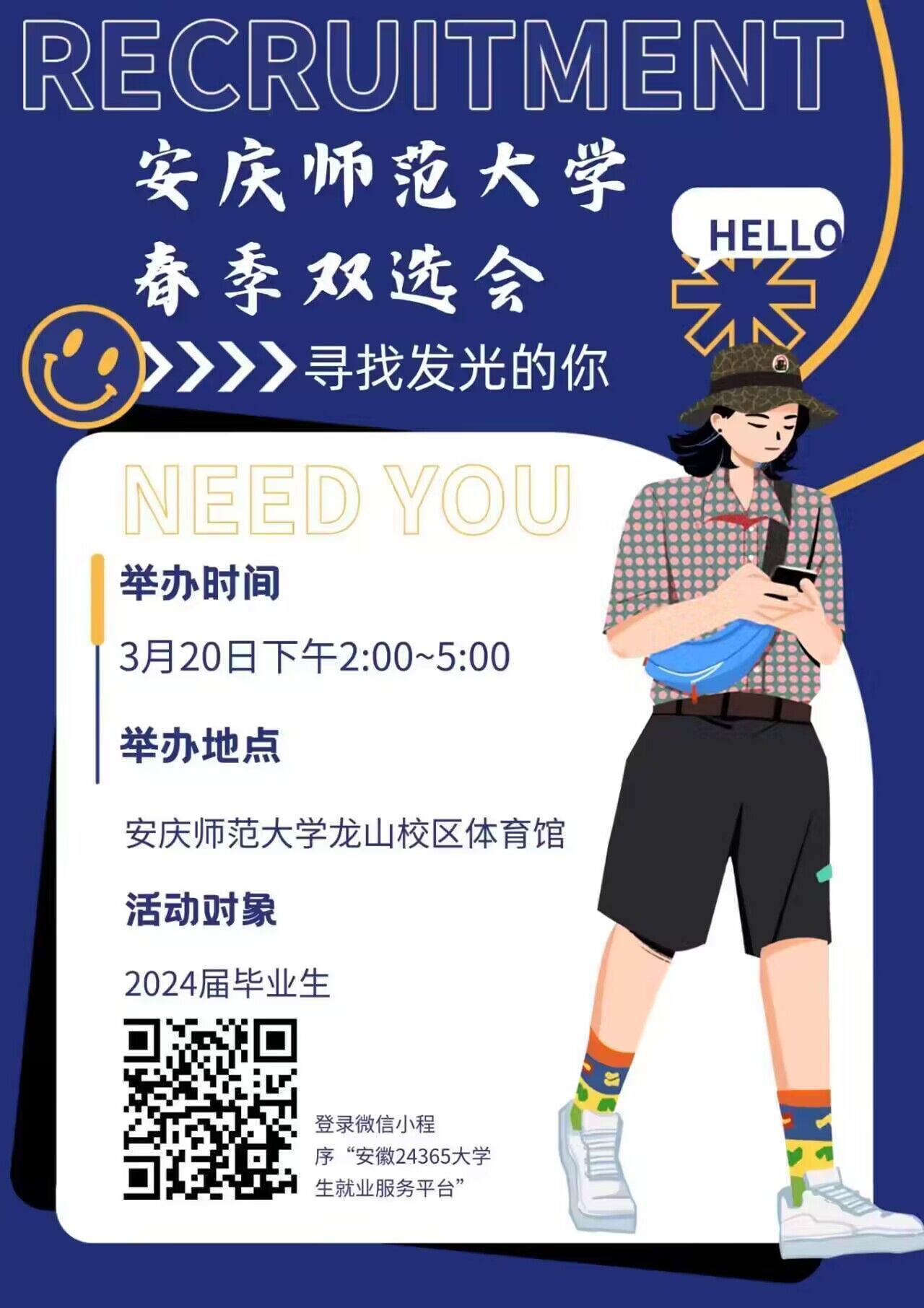 3月20日下午2:00,在龙山校区体育馆将举办2024届毕业生春季双选会,届时会有超过250家单位(含90家师范类用人单位)进校招聘,请毕业班同学积极参加,扫码可查看具体岗位和单位展位号,通过“安徽24365老员工就业服务平台”微信小程序可在线投递简历并查询更多详情。同时也欢迎低年级同学到场观摩!