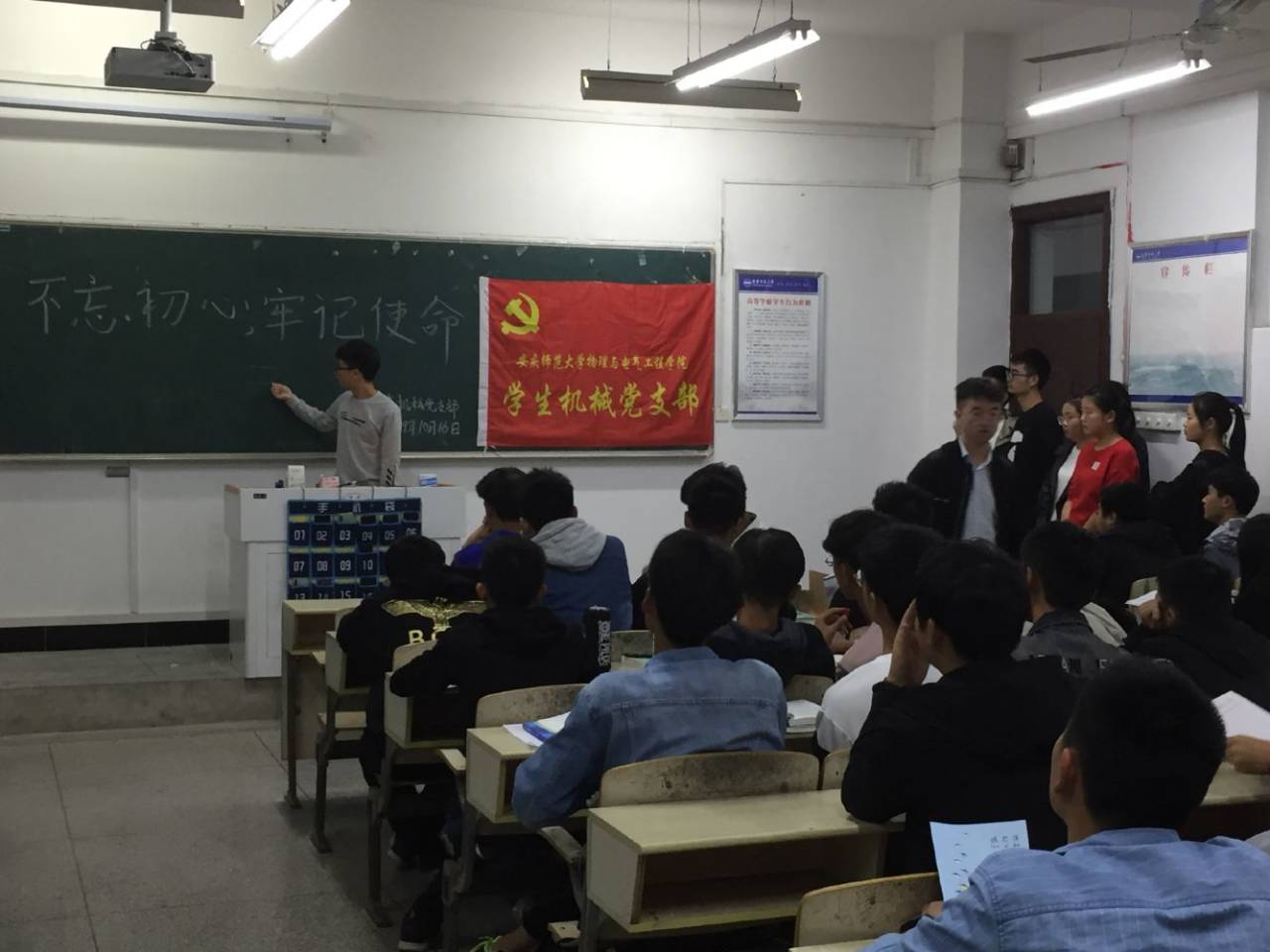 在进班级之前,员工机械党支部书记在稼先楼多一法组织召开党员会议。会议中,支部书记向员工党员详细地介绍了入党流程、入党申请书的格式以及入党申请书的内容,并表明本次支部活动是以向全体2019级新生机械班普及入党知识为初衷,为中共党员培养后备军。随后,第一、第二党小组组长组织支部同志动身前往新生班级,向新生宣传介绍中国共产党的相关知识,并且指导大家写好入党申请书,本次活动在新生班级内取得了良好反响。
