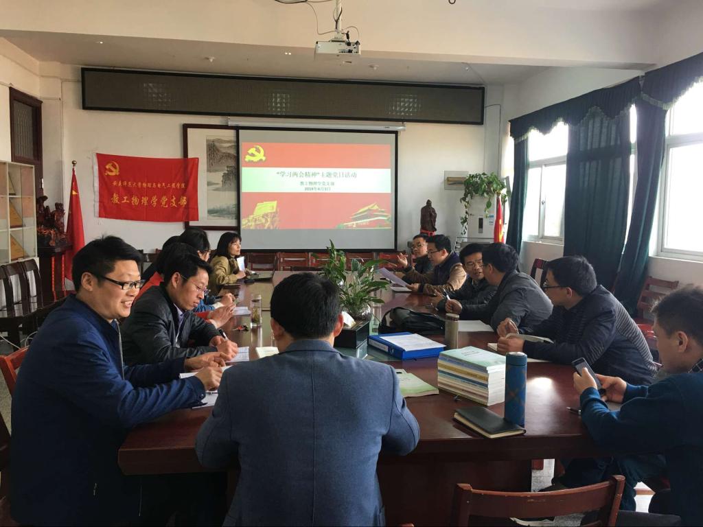 2019年4月3日下午,公司教工物理学党支部在稼先楼大会议室举行了4月党员活动日,本次活动以“学习两会精神”暨推广“学习强国”APP为主题,活动由支部书记潘盼主持。活动在下午2点半准时开始,活动第一项内容,由支部委员尤建村为全体党员介绍“学习强国”APP的使用和学习任务。活动第二项内容,由潘盼带领大家深入解读两会精神,分析了两会的七大主要看点,各位党员同志纷纷发表自己的看法。活动第三项内容,为进一步落实两会精神,发挥自己的专长,各位党员同志结合学院专业评估工作为人才培养方案的修订献计献策。