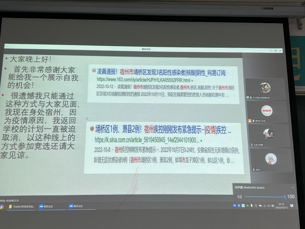 “很遗憾我只能以这种方式与大家见面,通过线上会议来竞选。”由于宿州突然发生疫情,打乱了班级员工马乾坤的返校计划,他陷入不能回学校又不想放弃竞选的两难境地。“感谢辅导员能够给我这次机会,在屏幕外听到同学们鼓励的掌声,我感受到班级的温暖。”凭借着为班级服务的积极态度与较广的知识面,马乾坤成功线上竞选班级团支书一职。