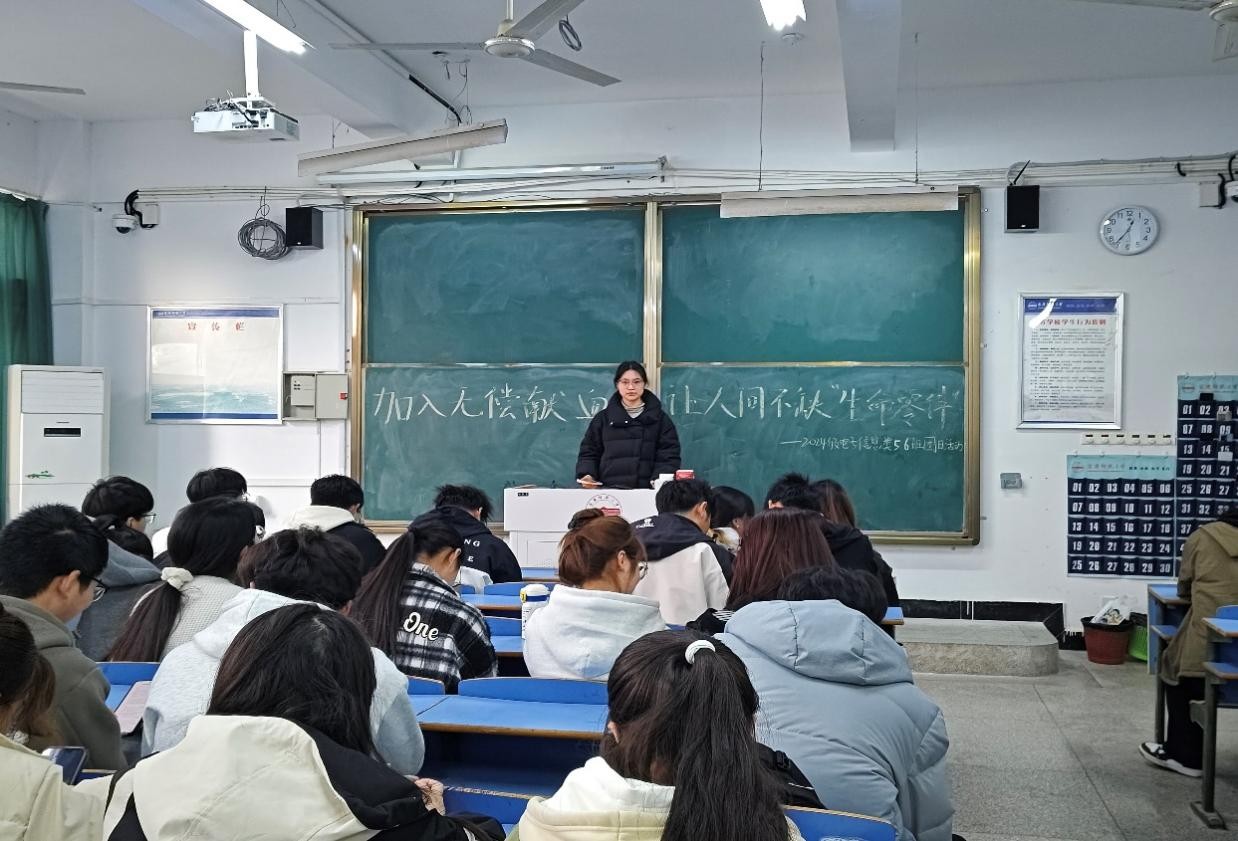 2024级电子信息5、6班共同开展“加入无偿献血,让人间不缺‘生命零件’”的活动,主持人周妍宣读倡议书,向大家介绍献血活动时间和地点安排,随后强调了献血过程中的注意事项,例如献血前的饮食、心态方面以及献血后的身体恢复等。周妍表示:“积极参与献血活动是件共荣且温暖的事,但也希望献血者保护好自己的身体,在这过程中避免受伤,科学献血。”