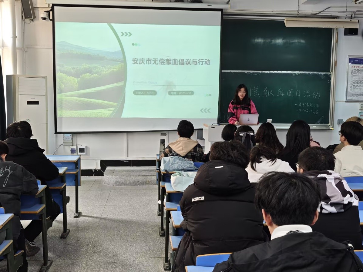 2024级电子信息类3班开展“无偿献血”主题团日活动,主持人郭洺彤表示安庆市血库告急,患者输血需求紧迫,并向青年团员发出无偿献血行动的倡议。青年是社会的中坚力量,应积极响应社会需求,承担社会责任,为公益事业贡献力量,传递一份爱,一份温暖。