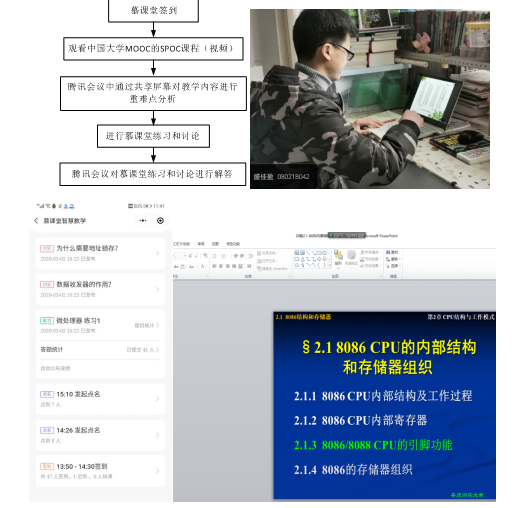 为了做好“停课不停学”工作,保证疫情期间的本科生教学工作,学校和学院提前制定线上教学方案、全力丰富在线教学资源、积极构建高效教学模式,依托各级各类在线课程平台、校内网络学习空间等,采取在线学习、直播授课等教学方式。针对2018级电子信息科学与技术专业《微机原理与接口技术》课程,探索“MOOC+腾讯会议+QQ群”线上教学模式,下面以《8086/8088微处理器》为例加以说明。
