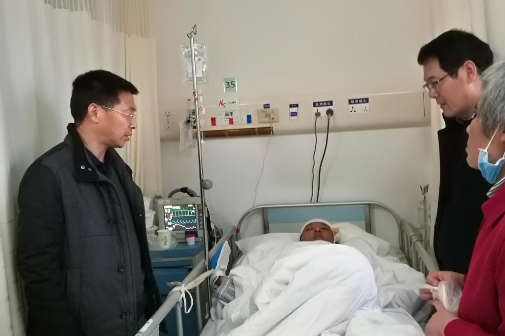 在病房中,校领导汪时珍教授与患者家长做了亲切交谈,表达了学校领导、老师和同学对赵李同学关心和支持,并将全校师生为赵李同学治疗募捐的16万元善款送到该生家长手中,鼓励他们积极配合治疗,好好休养,调整好心态争取早日战胜病魔。