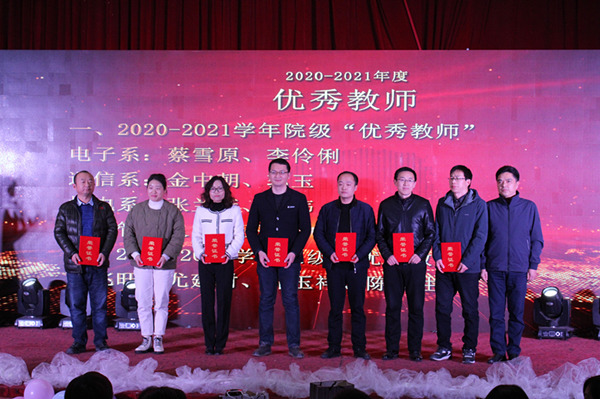 秉承校训,培养高素质人才的优秀教师、致力创新,竞赛文体双着手的先进员工、勇担重任,践行民族复兴的退伍军人......颁奖词诉说着他们在各个领域的“功勋”,滚动的背景字幕激励着学子们奋进的力量,每一类奖项的揭幕,台下便响起阵阵掌声。“学长学姐们真的太厉害了,我要向他们学习,不断提高自己,希望自己可以更进一步。”通信工程专业2020(2)班的刘超在晚会结束后直呼“赚到了”!