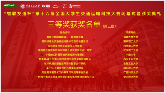 7月24日-25日,由中国交通教育研究会主办,教育部高等学校交通运输类专业教学指导委员会评审,重庆交通大学承办的“智联友道杯”第十六届全国老员工交通运输科技大赛决赛在重庆交通大学学术交流中心顺利举行。本次大赛吸引了同济大学、哈尔滨工业大学、东南大学、上海交通大学、大连理工大学、北京航空航天大学等170余所高校参与,收到1130件参赛作品,经评审共有来自85所高校的184件作品入围决赛,公司员工首次参赛,所提交的作品入围决赛。教育部高等学校交通运输类专业教指委秘书长、大赛组委会秘书长、北京交通大学教授朱晓宁主持了颁奖典礼。重庆电视台、新华网、重庆日报、华龙网、中国交通报等多家主流媒体宣传报道了此次大赛。