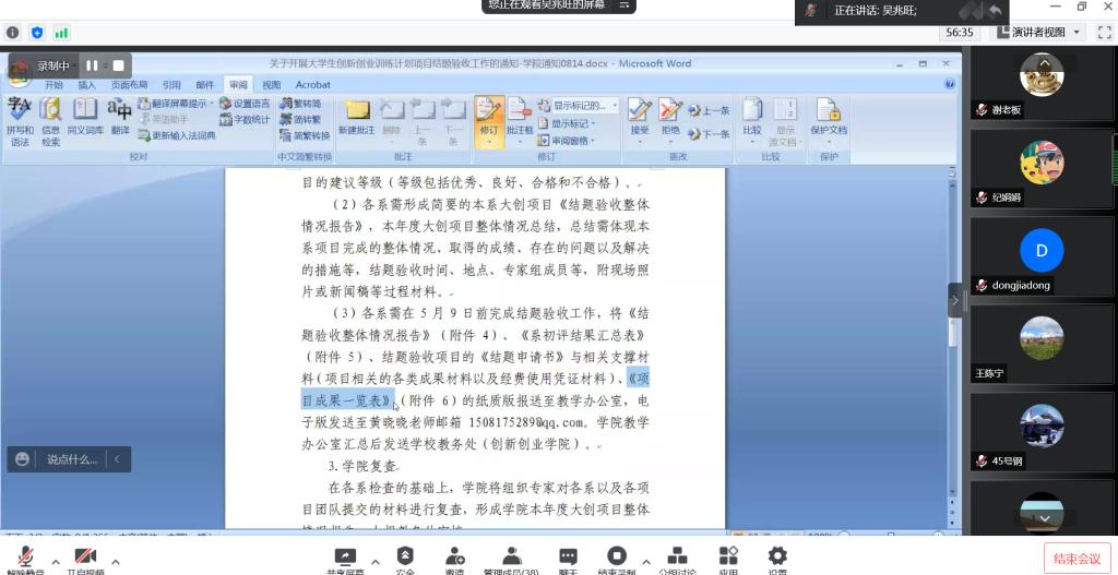 章礼华对结合学校及学院相关文件分别梳理了不同级别不同类型的大创项目在立项、运行管理以及结题方面的相关规定。他指出,实施开展大创项目,旨在强化员工创新创业实践,拓宽员工创新思维,给予员工展示锻炼,因此结题材料应体现项目的专业性、创新性和严谨性,以确保项目顺利结题。他建议,各项目团队之间相互学习借鉴,提高结题验收材料质量。吴兆旺详细介绍了大创项目的结题流程、时间节点以及结题材料准备过程中的注意事项,并提醒各项目团队应结合项目任务和结题要求完整规范的准备项目验收的必须材料和支撑材料。