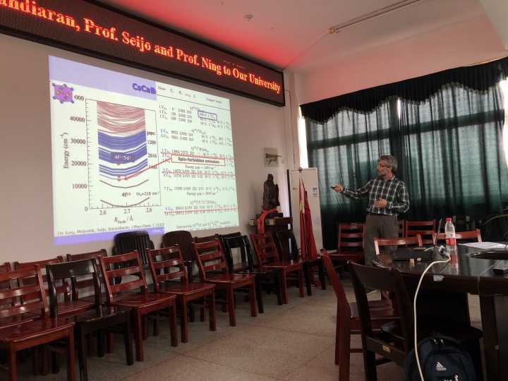 Luis Seijo教授首先简要介绍了研究杂质激活发光材料所采用的多组态量子化学从头计算方法。接着,展示通过该方法计算所获得的价间电荷转移、金属向金属的电荷迁移、配体向金属的电荷迁移等固体发光材料中各种电子转移过程的位型坐标图。然后,根据理论计算结果与实验结果的对比分析,成功给出了发光材料中所涉及的发光过程及其微观机理。最后,Luis Seijo教授认真细致地解答了参会师生提出的学术问题,现场气氛热烈,互动不断。此次报告开阔了在座师生的学术视野,让大家接触到当前材料模拟与计算领域的国际前沿研究动态,营造了良好的学术交流氛围。