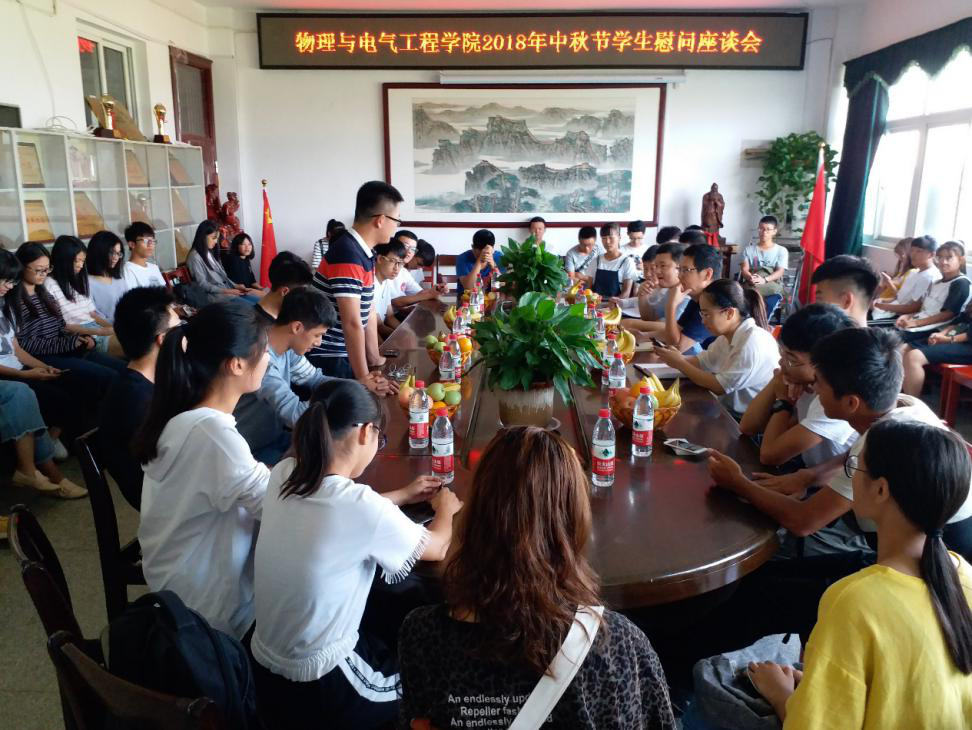 此次座谈会气氛融洽,荡漾着温馨的话语,洋溢着师生间深厚的情谊,亲情般的关怀沁入在场同学,让留校同学们感受到了学院的关怀,感受到了浓烈的节日气氛。增强了同学们努力学习的信心,也加深了师生之间的认识和了解。中秋节期间,除学院组织的慰问座谈会外,物理与电气工程学院各班级也开展了丰富多彩的留校员工中秋节日纪念活动。(韦佳佳)