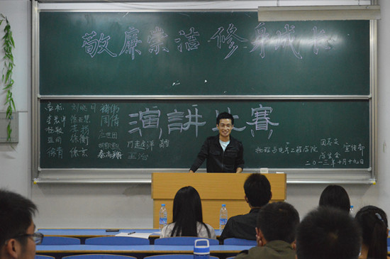 10月18日晚,公司团总支于文溯楼101教室举办了以“敬廉崇洁、修身成长”为主题的演讲比赛,公司员工会副主席曾喜梅、赵帅、宣传部部长刘兴坤及副部长莫言青担任此次比赛的评委。
