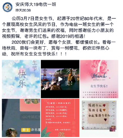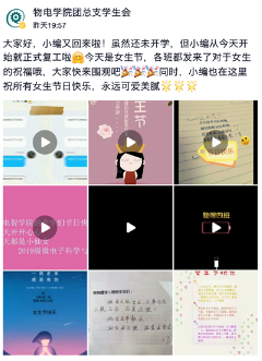 时遇“三·七”女生节,虽因疫情不能相聚,但电子工程与智能制造学院的男生们仍在线上为学院的女生们送上了专属祝福。