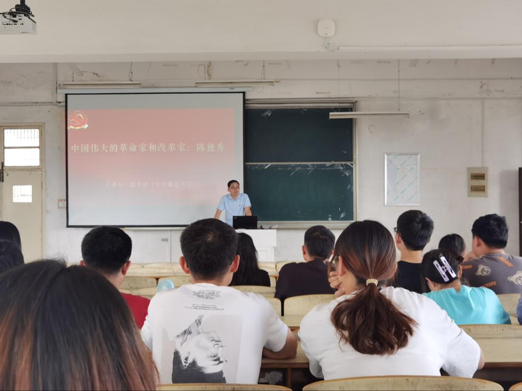 课上,操龙德老师为我们讲述了中国伟大的革命家和改革家—陈独秀的故事,从陈独秀的生平事迹、陈独秀的历史贡献、对陈独秀的评价三个方面分别介绍了陈独秀波澜起伏的一生,并从其所处的时代和历史条件中客观剖析了陈独秀的党建思想和历史贡献,由点及面地带领我们学习了建党初期的历史实际,引导全体党员从陈独秀正反两方面的历史经验中汲取营养,获得启迪。在讲到陈独秀的历史贡献中,操老师着重强调了陈独秀是中国共产党最主要的创始人,如果没有陈独秀,就没有中国共产党在1921年的成立!单从这一点我们深刻体会到陈独秀对中国共产党成立的重要意义。