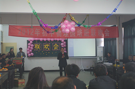 2012年12月7日下午,公司与初中物理国培班在稼先楼北404教室共同举办了“收获国培”主题联欢会,学院副经理江贵生、班主任吴兆旺老师、李娟老师、初中物理教学能手班和初中物理学科带头人班的全体国培学员以及部分师生参加了本次联欢会。