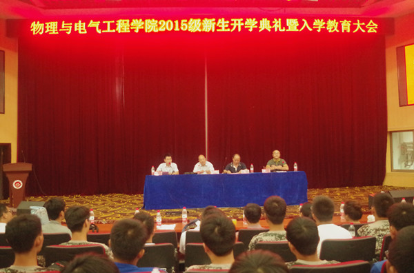 公司教师代表章礼华教授根据自己的求学经历,希望新生要抓住基础课程、学好专业课;员工工作办公室蒋立永老师宣读了《物理与电气工程学院2015级新生入学教育实施方案》;老生代表郭燕如分享了她大学的经历和感悟;朱媛龙同学代表新生做了表态和励志的发言。
