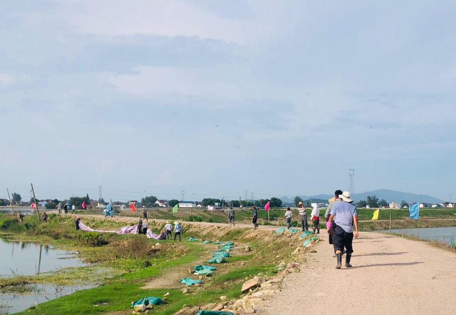 图为村民们以分组的形式进行挡浪棚的铺盖工作,对大坝一侧的泥沙进行巩固。