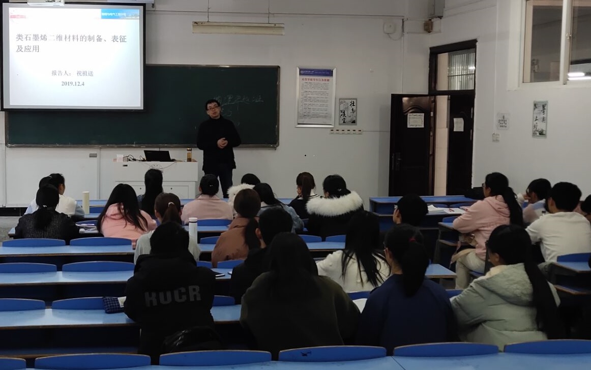 12月4日下午,公司祝祖送老师在C103教室,为2019级物理学卓越班全体同学和2018、2019级光电信息科学与工程专业部分同学作了题为“类石墨烯二维材料的制备、表征及应用”的学术报告。