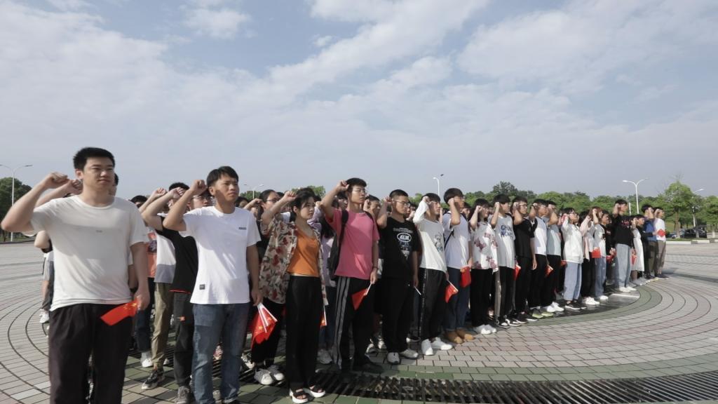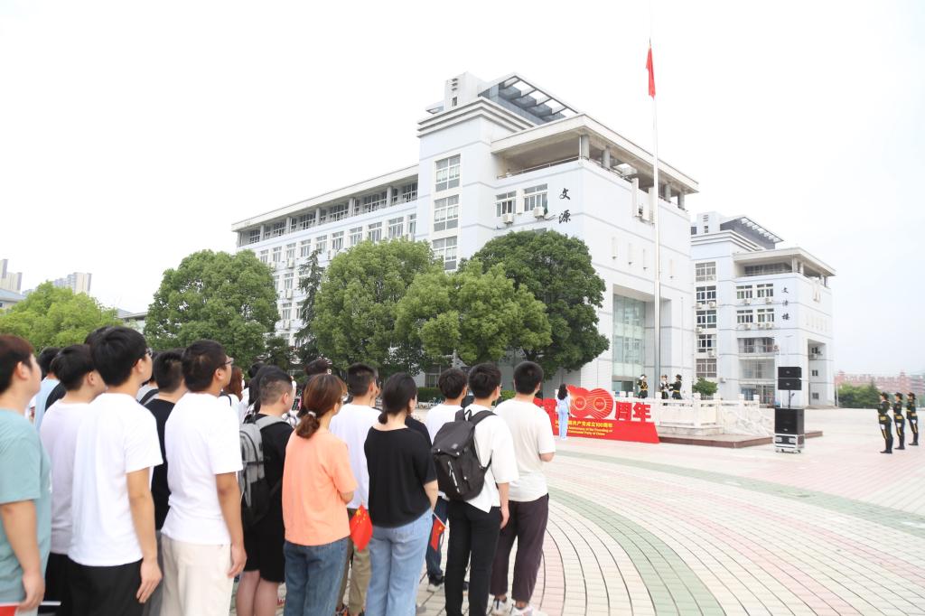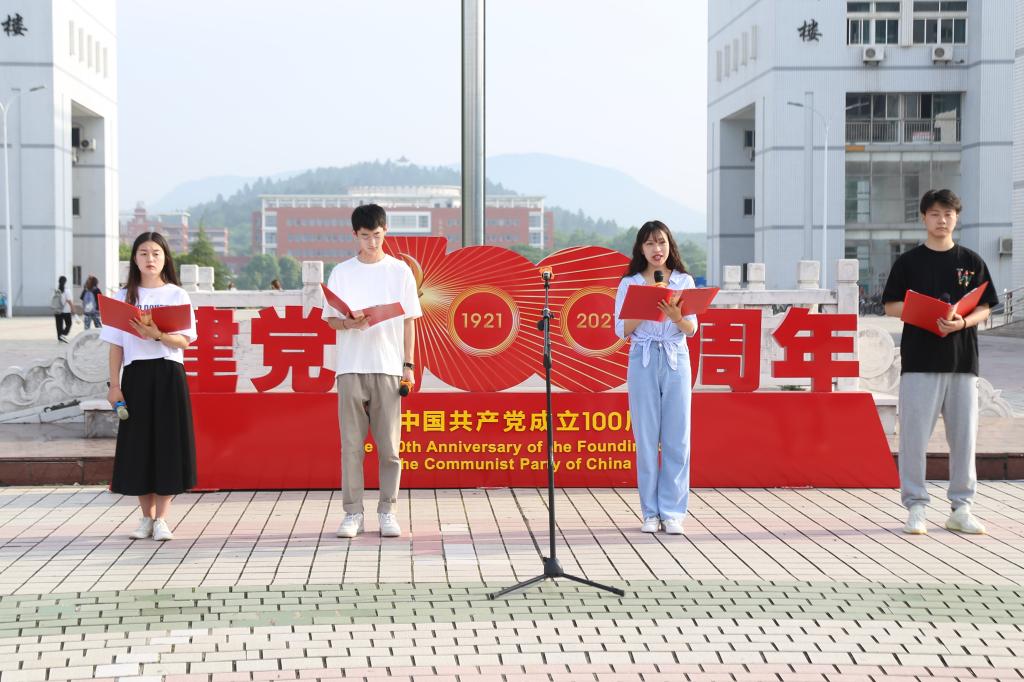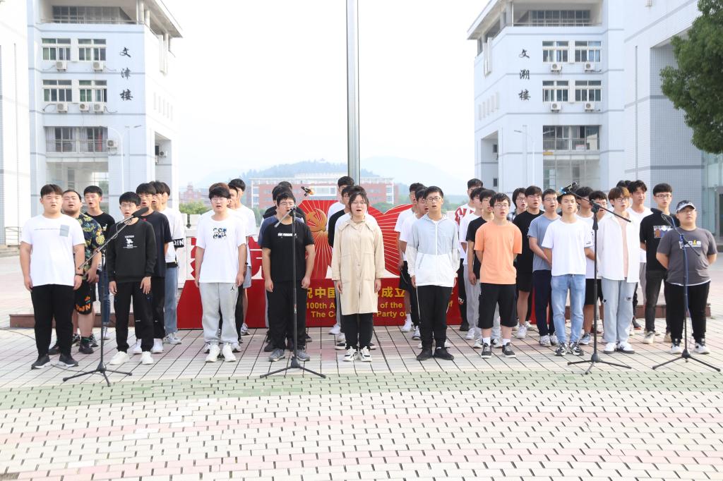 在五星红旗下,全体师生开展了诗歌朗诵和大合唱等活动。“从秋收起义的长缨到八一起义的枪声,从井冈山头的号角到长征路上的坚韧,您如灯塔指引着我们前行……”。学院员工进行诗歌朗诵,带领在场员工们回顾了中国共产党的百年发展历程。现场,全体师生深刻缅怀了袁隆平和和吴孟超两位院士。“我从小是听袁隆平爷爷的故事长大的,每当想到他已经阖然长逝时,心里总是很失落不舍。”朗诵者之一的电子信息类专业2020(2)班的唐增楠称,当朗诵到关于袁隆平院士的内容时,内心深有感触。“很荣幸能够站在国旗下朗诵,我深刻感受到国家的繁荣富强离不开党的正确领导,作为一名入党积极分子,我也会积极去向党组织靠拢。”他说 。