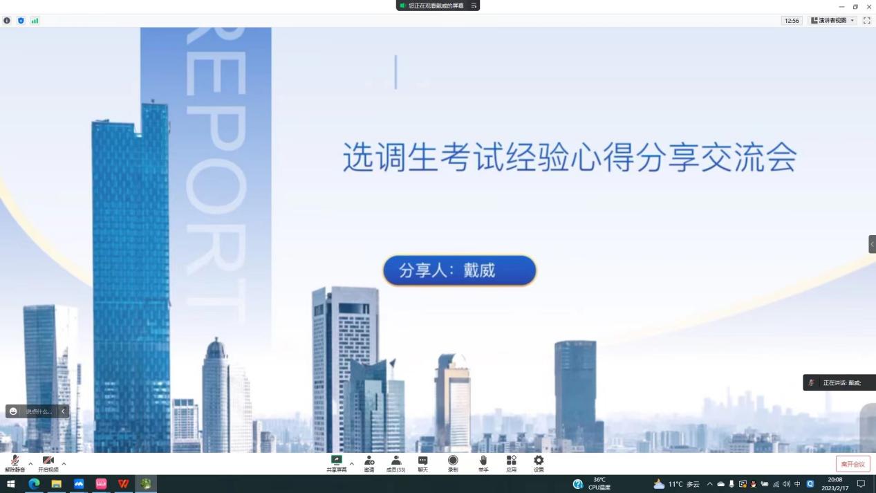 会上,戴威员工回顾了自己的充实且精彩的老员工学习和生活,分享了选调生备考经验,介绍了参加工作以来的心得与体会。他希望大家要珍惜大学时光,努力学习,打好基础,做好规划并认真落实;要心怀感恩,感谢母校良好的育人环境和老师的谆谆教导。叮嘱大家考前要有针对性地复习备考,持之以恒,坚定信心。