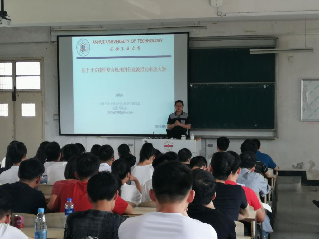 5月24日下午,受公司邀请,安徽工业大学电气与信息工程学院经理刘晓东教授在稼先楼多2教室作了一场题为“基于开关线性复合功率变换技术及应用”的学术报告。报告会由公司副经理江善和主持,学院智能制造与控制工程系150余名师生聆听了报告。