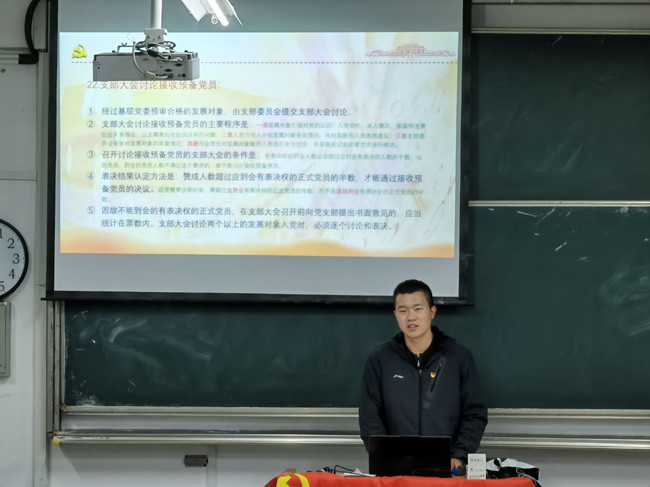 10名党史学习教育宣讲团成员利用晚自习时间深入到新生班级开展党史宣讲和入党启蒙教育。活动分为二个部分:第一部分,宣讲“两弹元勋”邓稼先的生平事迹。结合微视频故事播放,宣讲团将邓稼先的爱国精神、科学精神和奉献精神诠释得淋漓尽致。“邓稼先1948年到美国普渡大学留学,只用了一年零九个月的时间就获得博士学位,获得博士学位以后的第九天,他就踏上了回国的旅程。他为什么回来?新中国成立了,他要回来建设新中国。过去无数像邓稼先的仁人志士为实现国家富强和民族复兴奉献出了自己的一切。今天我们要接好时代发展的‘接力棒’,继承先辈的红色基因,立志成才,为实现中华民族的伟大复兴而努力奋斗……”,宣讲团成员吴晓琪进行着激昂地宣讲。邓稼先的先进事迹使在场的新生备受感动和鼓舞,纷纷表示一定要继承邓稼先精神,立足专业,勇于创新,勤奋实践,练好本领,用科技知识报效祖国。第二部分,宣讲团成员开展新生入党启蒙教育,介绍中国共产党的基本知识,详细讲解入党的标准、条件及基本程序,强调端正入党动机的重要性,并结合自身的入党经历鼓励同学们坚定理想信念,刻苦努力学习,时刻以党员的标准来严格要求自己,用实际行动践行党的宗旨,积极向党组织靠拢。“通过这一次的入党启蒙教育,我充分了解到了党员的基本条件是什么,入党有哪些基本程序和流程,如何撰写党员发展的相关材料,等等。我今后一定要加强政治学习,不断地充实提升自己,积极地向党组织靠拢,不仅在组织上入党,更要在思想上入党。”2021级电子信息大类5班马梦娇同学说道。