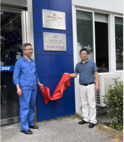 电子工程与智能制造学院经理董甲东与安庆中船柴油机有限公司总经理倪渐长共同为实践教学基地基地揭牌。