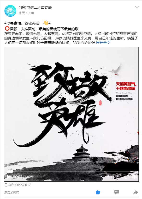 年初,随着新冠肺炎疫情在全国各地大面积、大范围的爆发,十四亿中华儿女的心紧紧相连,大家都在为抗击疫情不断做出自己力所能及的贡献。2018级电子信息科学与技术(2)班的同学们也没有丝毫懈怠,4月8日,全班同学在团支书张倩的带领下,顺利开展了此次主题为“以书寄情,致敬英雄”的线上团日活动。
