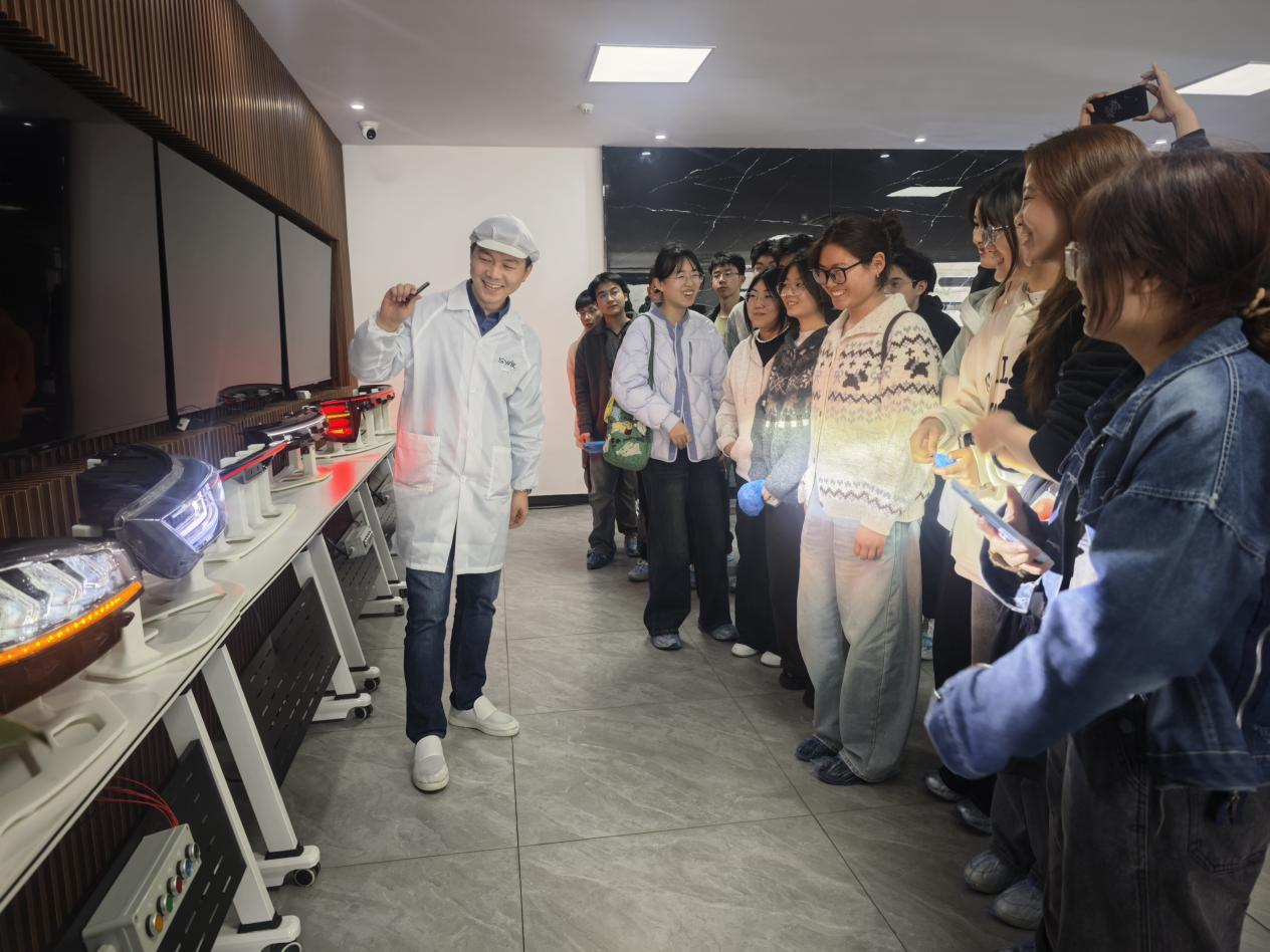 企业技术人员结合智能车灯实物,讲解车规级 LED 驱动、光学配光设计及性能测试标准,现场演示自适应照明功能,同学们认真聆听交流。