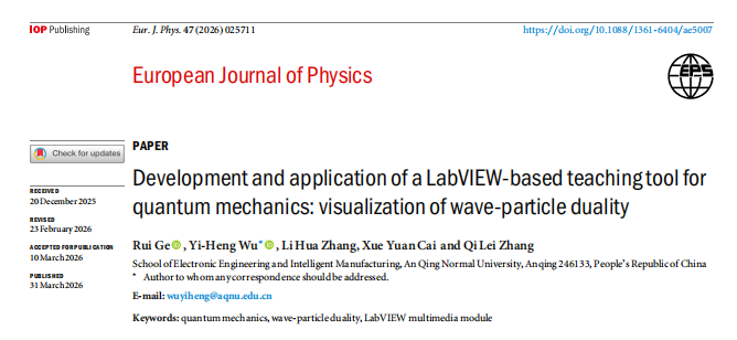 3月31日,122cc太阳成集团吴义恒教师团队的教学研究论文《Development and Application of a LabVIEW-Based Teaching Tool for Quantum Mechanics: Visualization of Wave-Particle Duality》正式发表于欧洲物理学会旗下专注高等物理教育研究的国际期刊《European Journal of Physics》。