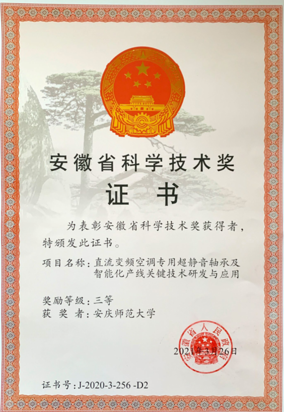 近日,安徽省科学技术奖励暨加快建设科技创新攻坚力量体系推进大会在合肥召开,会上省人民政府公布了《安徽省人民政府关于2020年度安徽省科学技术奖励的决定》(皖政〔2021〕23号)。公司联合申报的研究成果《直流变频空调专用超静音轴承及智能化产线关键技术研发与应用》喜获安徽省科技进步三等奖。