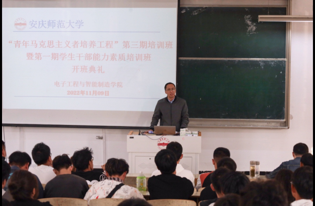 11月9日,电子工程与智能制造学院在稼先楼南100教室举行“青年马克思主义者培养工程”第三期培训班暨第一期员工干部能力素质培训班开班典礼。公司党委书记夏云高、党委副书记高栋梁出席开班典礼。全体专职辅导员、青马班全体员工共120余人参与典礼。仪式由团委负责人主持。