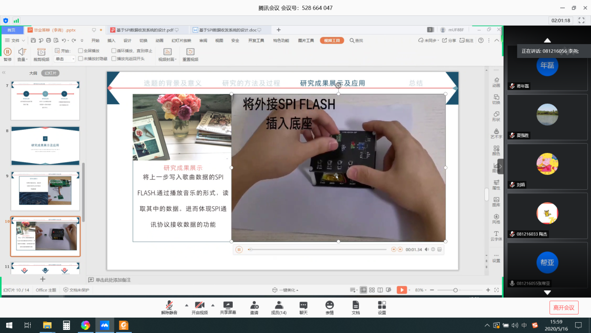 5月16日下午,电子系组织了2020届优秀毕业论文答辩工作,参加答辩的是微电子科学与工程和光电信息科学与工程两个专业推选的优秀毕业论文(设计)作者。受新冠肺炎疫情影响,答辩会通过腾讯会议平台进行。此次线上答辩是一次全新的尝试,虽有一定的挑战,但经过不断研讨、专业负责人和教研室主任的周密准备及师生的密切配合,电子系的优秀毕业论文(设计)线上答辩工作圆满完成。