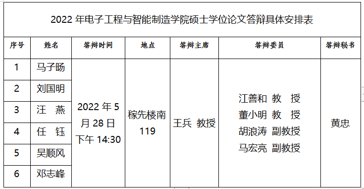 2022年电子工程与智能制造学院硕士学位论文答辩具体安排表