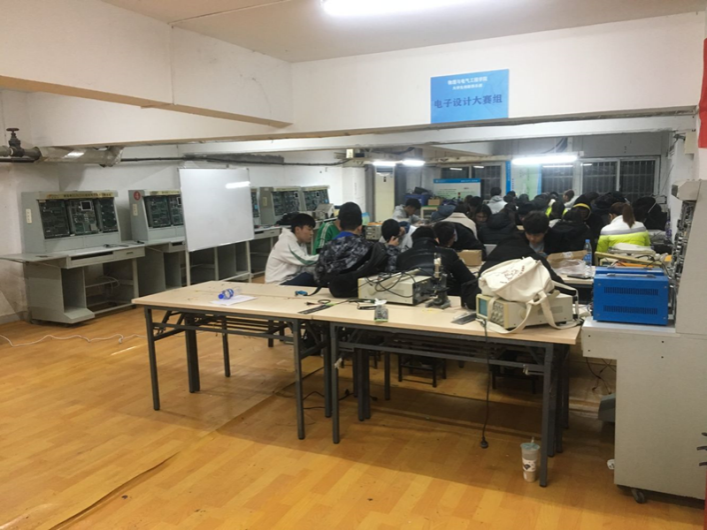 (电子信息科学与技术等专业员工在公司“三电”课程开放创新实验室进行电子设计大赛培训)