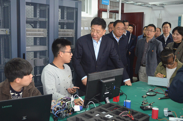 (2019年4月,安庆市委书记魏晓明在“教育部-中兴通讯ICT”产教融合创新基地指导通信工程专业员工开展第二课堂实践活动)