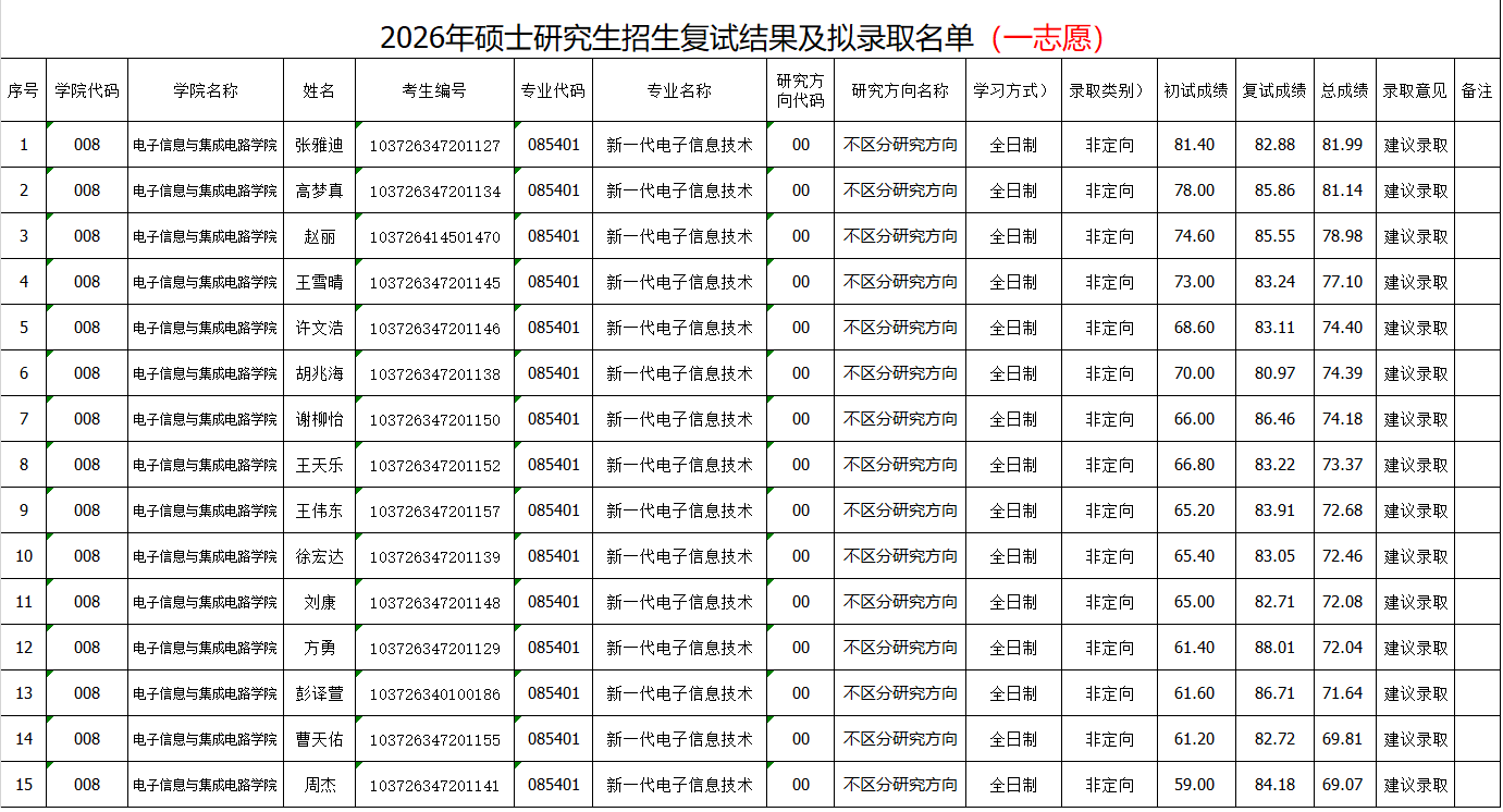 122cc太阳成集团2026年硕士研究生复试一志愿拟录取名单